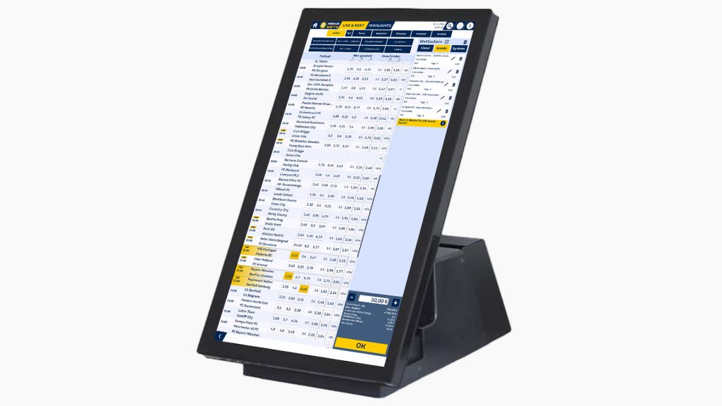 Dieses Touch-Terminal im Hochformat ist äußerst platzsparend (Standfuß oder Wandmontage) und kann eigenhändig, ohne Hilfsmittel jederzeit neu platziert werden. Das Touch Terminal ist eine optimale Ergänzung zur klassischen Wettabgabe.